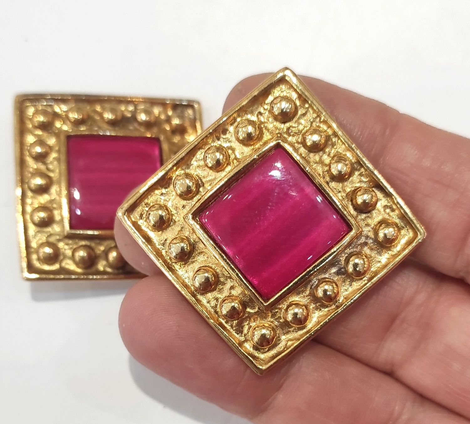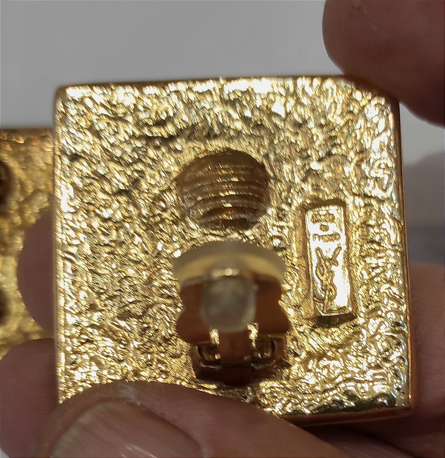 Élégantes boucles d’oreilles Clips YSL, conçues pour oreilles non percées. Un cabochon carré rouge trône au centre d’un motif géométrique, agrémenté de petites pépites d’or. La signature YSL est apposée à l’arrière.