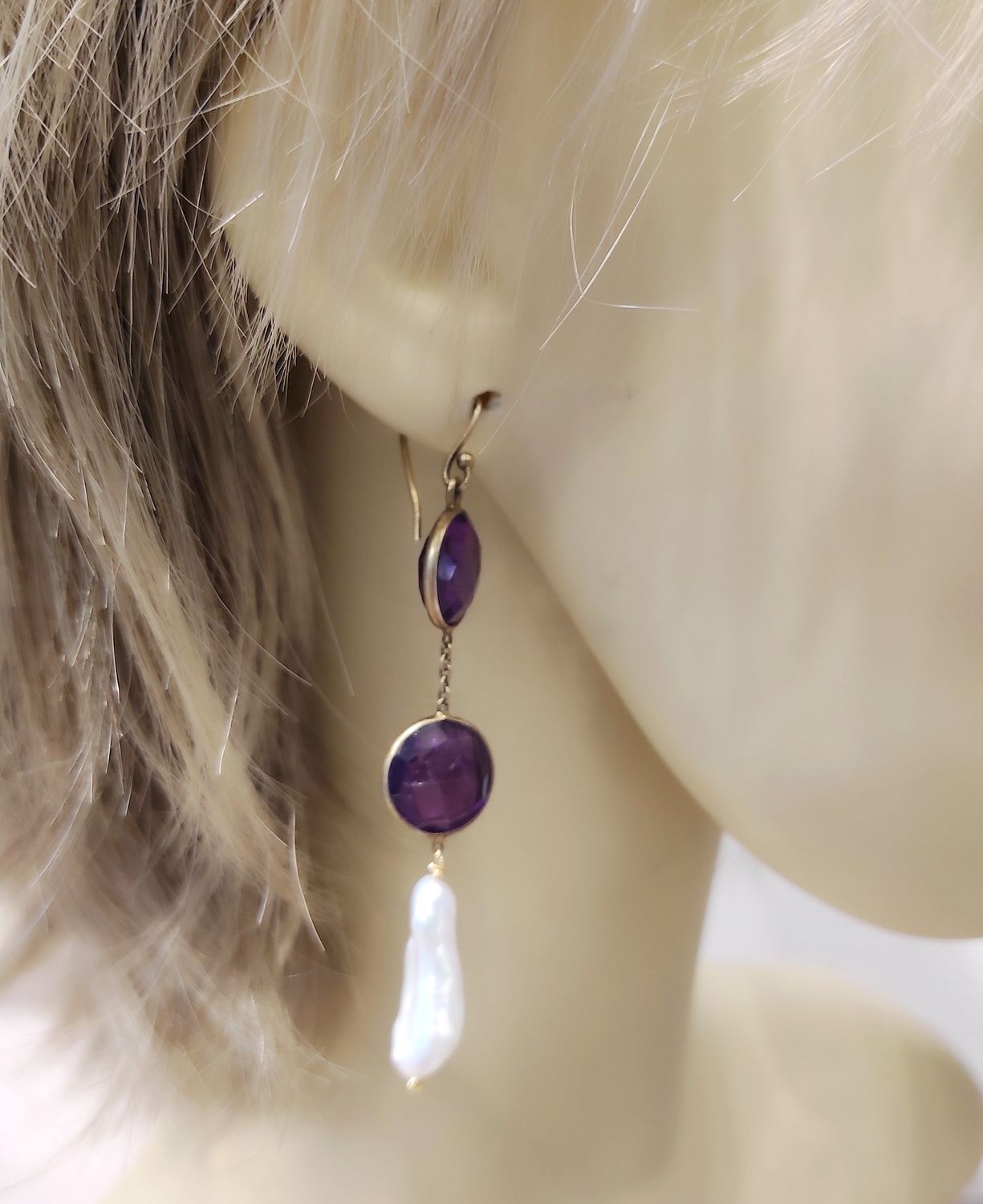 Boucles d’oreilles plaqué or, améthystes et perles de culture, pièce unique élégante