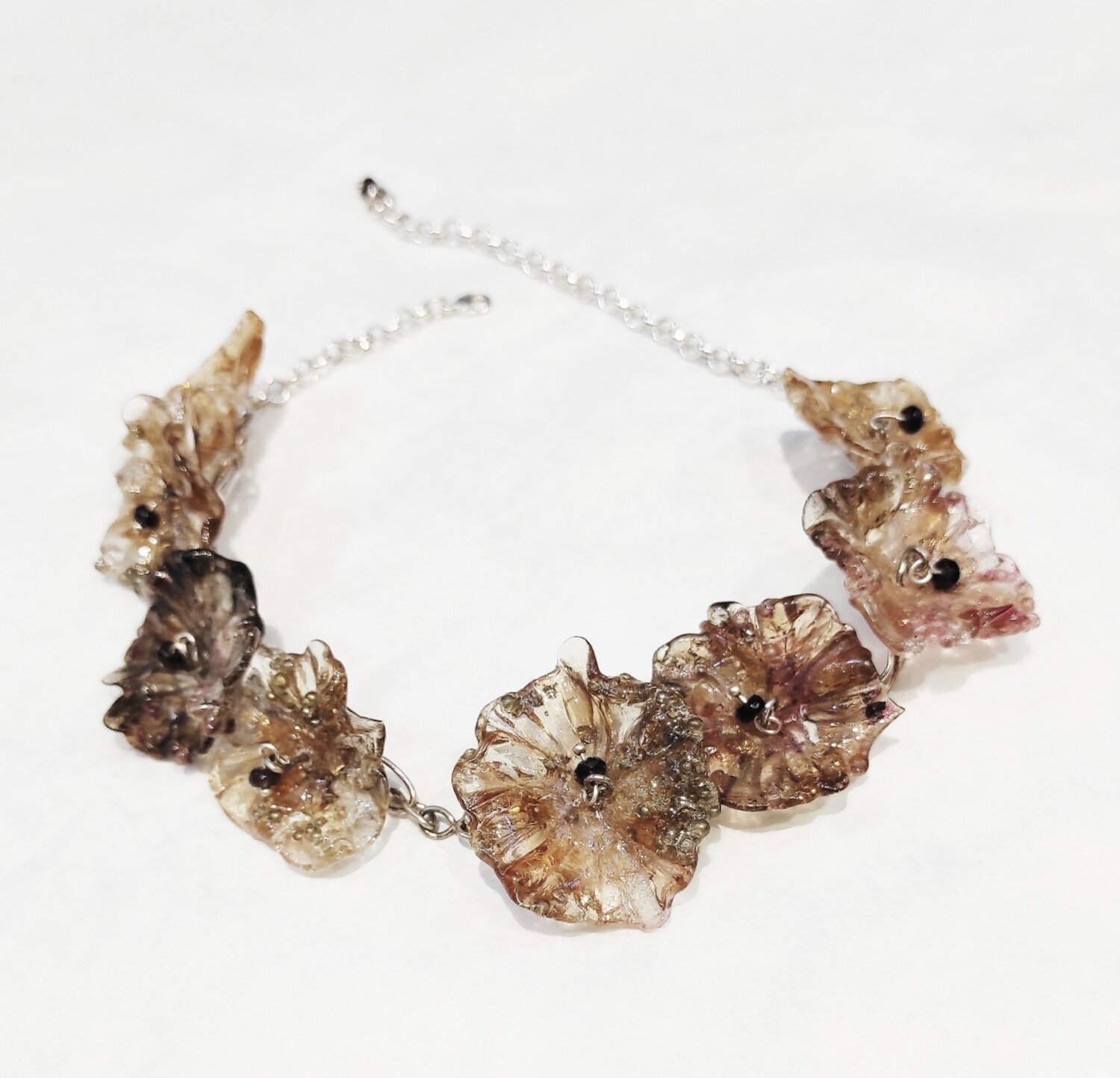 Création couture et poétique, ce collier ras de cou met en lumière la délicatesse et la force du coquelicot, fleur symbole de renouveau, de vitalité et d’élégance fragile.