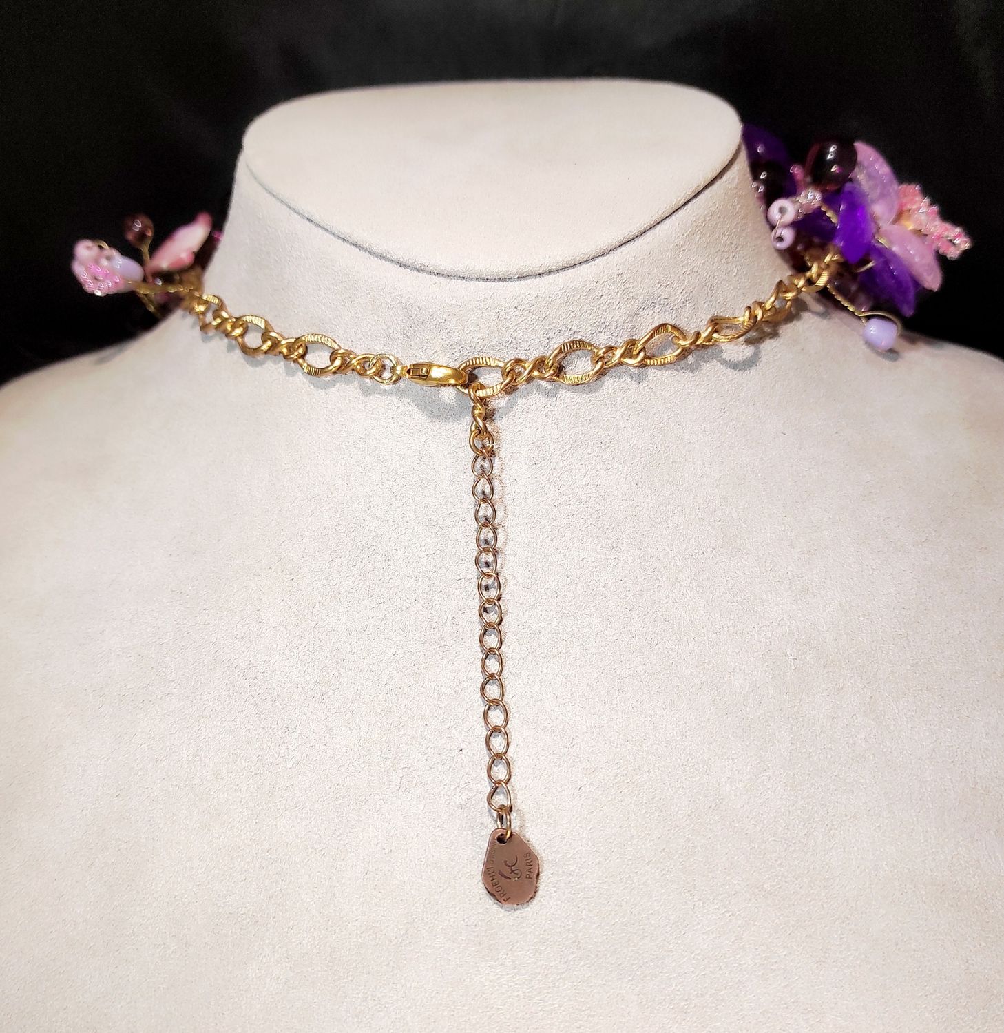 Son design organique s’inspire des entrelacs de branchages, réalisés en laiton doré, et sublimés par des strass scintillants, des pâtes de verre colorées et des fleurs en polymère. Chaque détail est minutieusement pensé pour que le collier épouse la ligne du cou avec fluidité.